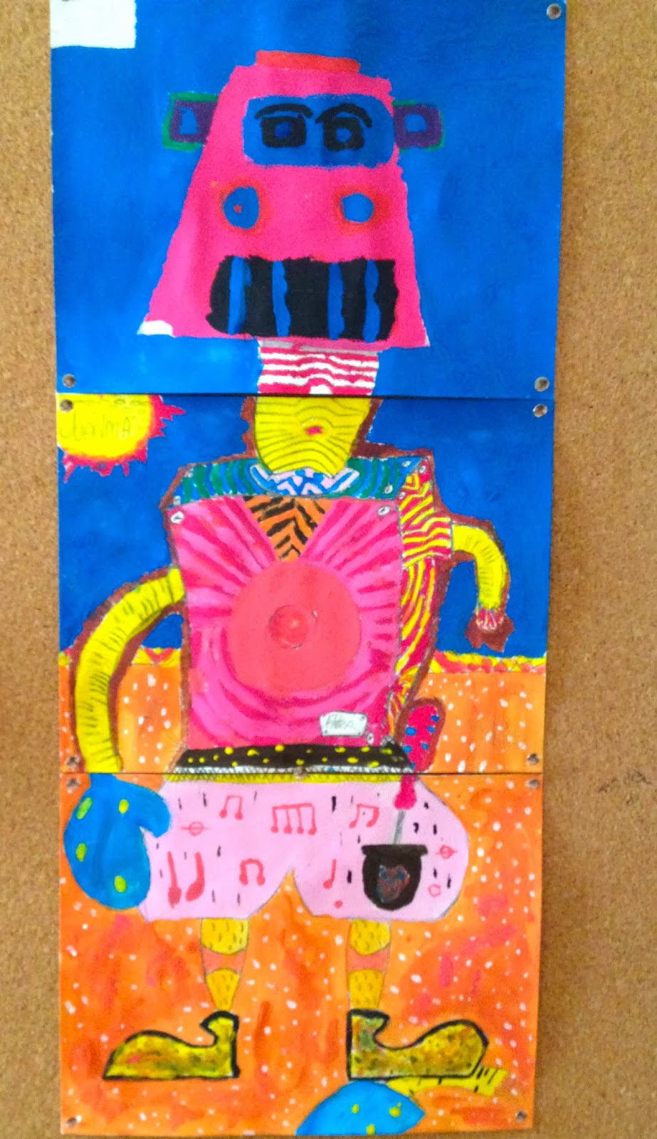 Tres alumnes realitzen una figura (“cadàver exquisit”) formada per tres parts (cap, cos i cames). Cada un s’encarrega d’una de les parts.