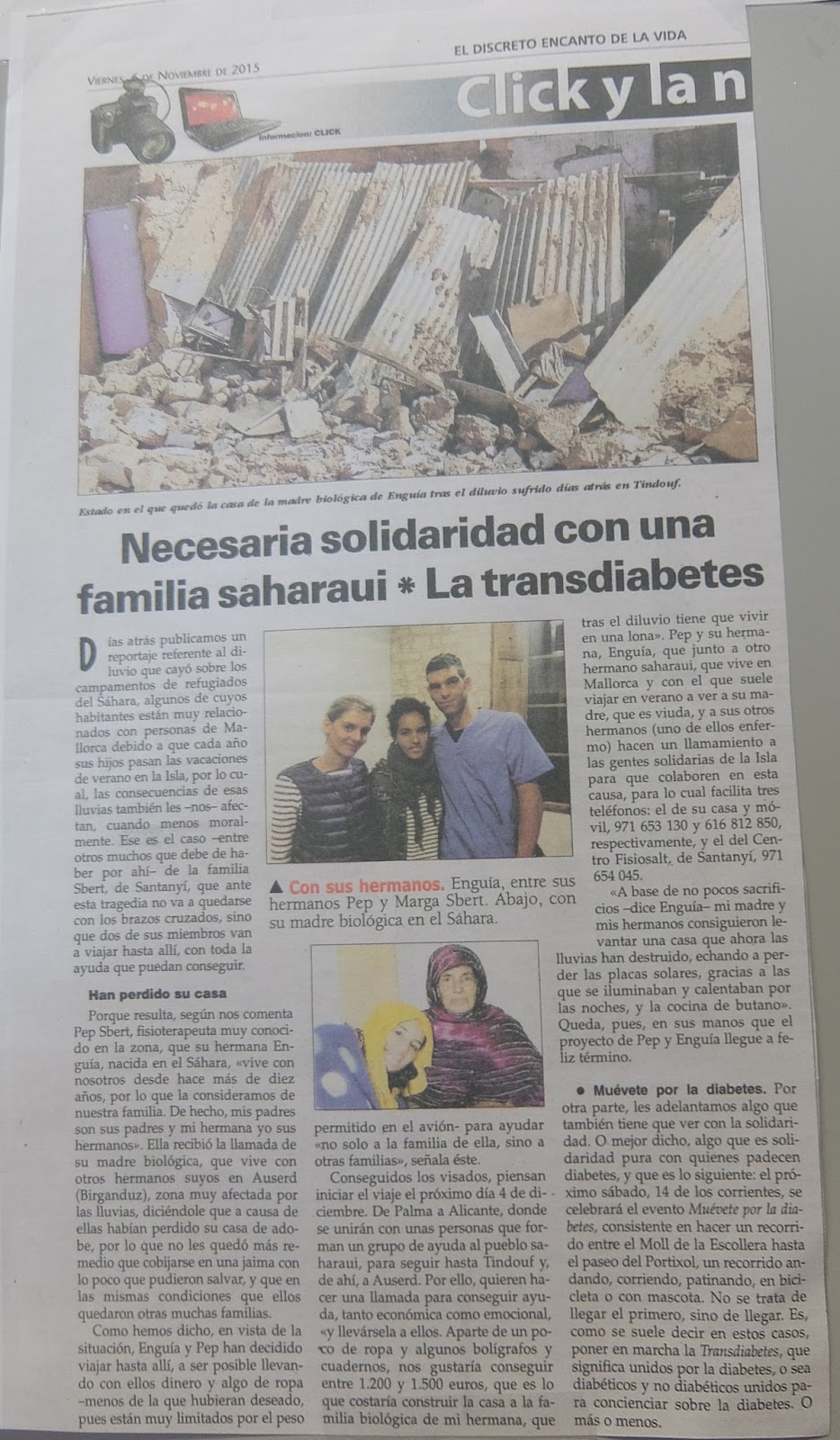 Cada estiu, amb el meu germà Omar, que també viu a Mallorca, anem als campaments a veure els germans i la nostra mare, que fa dos anys quedà viuda. L’ajudem amb tot el que podem. Amb el pas dels anys i molts d’esforços hem aconseguit aixecar una casa molt humil per a la nostra mare i els germans. Però les pluges torrencials que s’han produït al desert les passades setmanes han arrasat bona part de les haimes i casetes dels campaments. La nostra és una de les famílies més afectades: la casa era feta de fang i les parets no han aguantat, s’ha esbucat tot, s’han espenyat les plaques solars, la cuina de butà… Ho hem perdut tot.