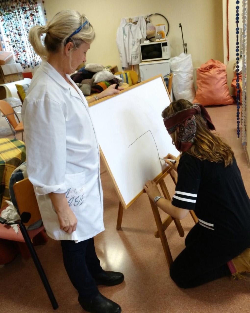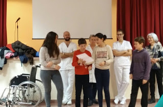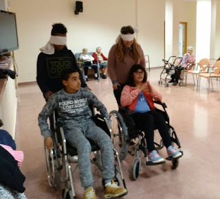 Quan hi arribàrem vam ser rebuts pels infermers que ens acompanyaren a berenar a la cafeteria, després amb grups de quatre vàrem realitzar un parell d’activitats acompanyats per un resident; d’activitats n’hi havia cinc: una carrera amb cadira de rodes, una entrevista al resident que ens acompanyava, construir un trecaclosques, fer mímica i pintar un objecte amb els ulls tapats.