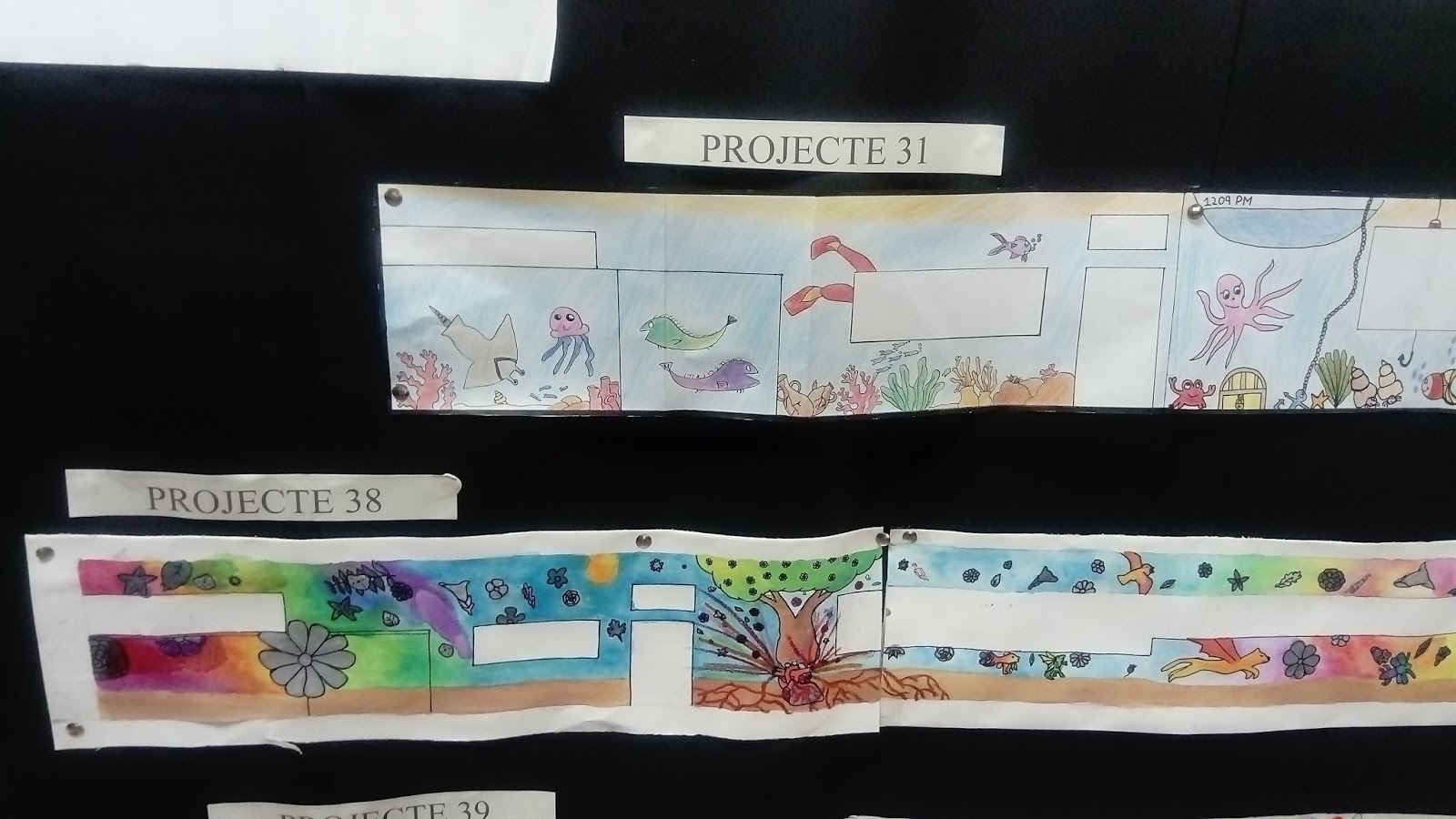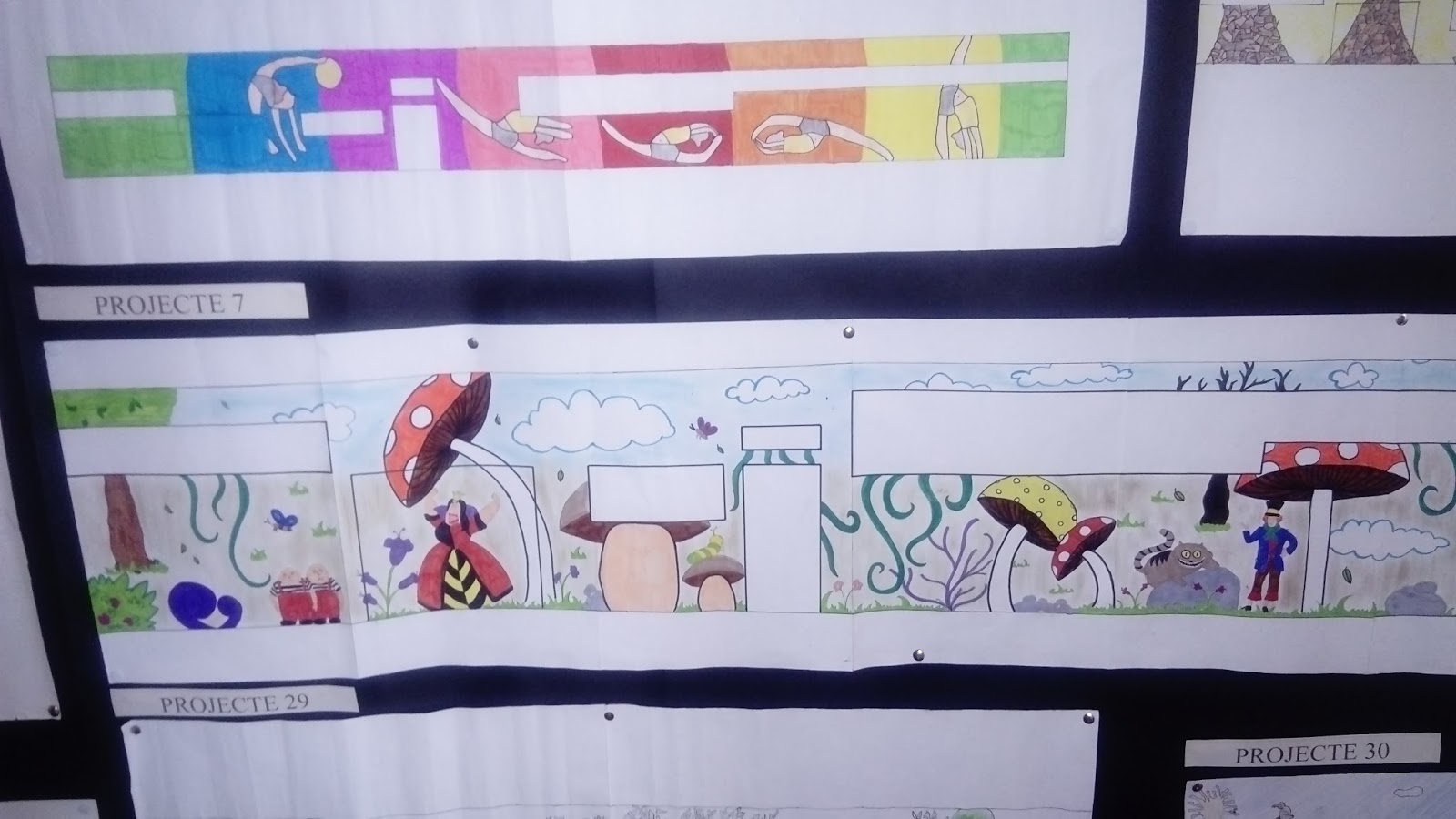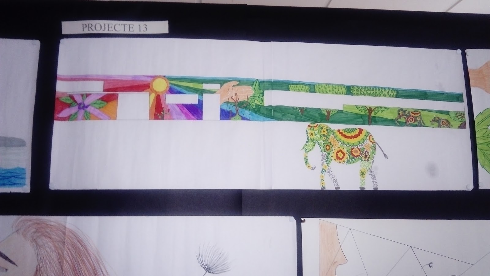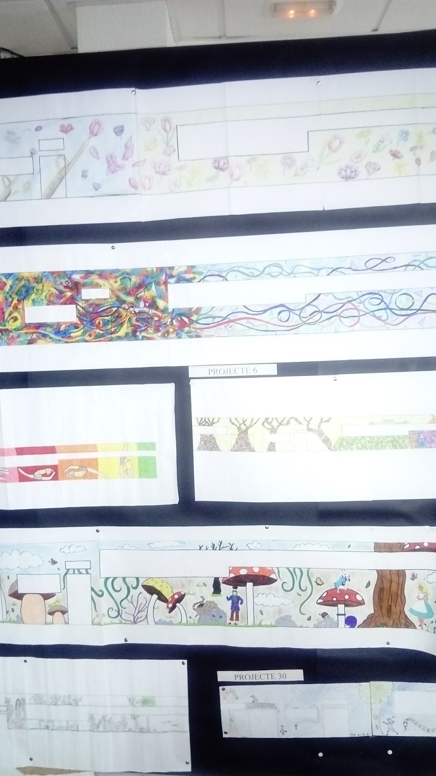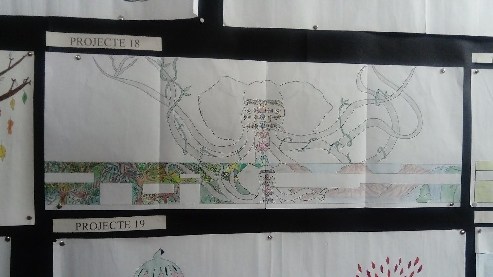 Al hall de l’institut hi ha exposats els projectes fets pels alumnes de Plàstica. Aquests treballs són propostes per al mural que decorarà la façana de l’edifici d’Agràries. Entre dia 24 i 25 professors i alumnes votarem el millor projecte, i el disseny guanyador serà el que després es pintarà.