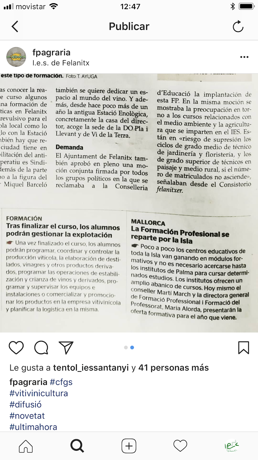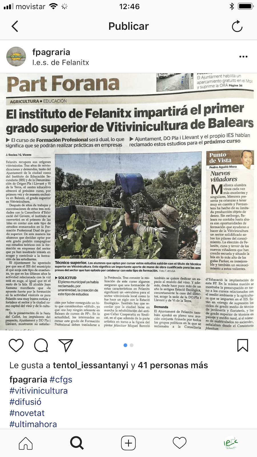 31 Mai, 2018 revistanodiguisdois Vitivinicultura Una notícia molt bona! A partir del proper curs, l’IES Felanitx ja comptarà amb el cicle formatiu de grau superior en vitivinicultura. Anirem ampliant informació. Compártelo: Share on X (S'obre en una nova finestra) X Comparteix al Facebook (S'obre en una nova finestra) Facebook M'agrada S'està carregant... Relacionats